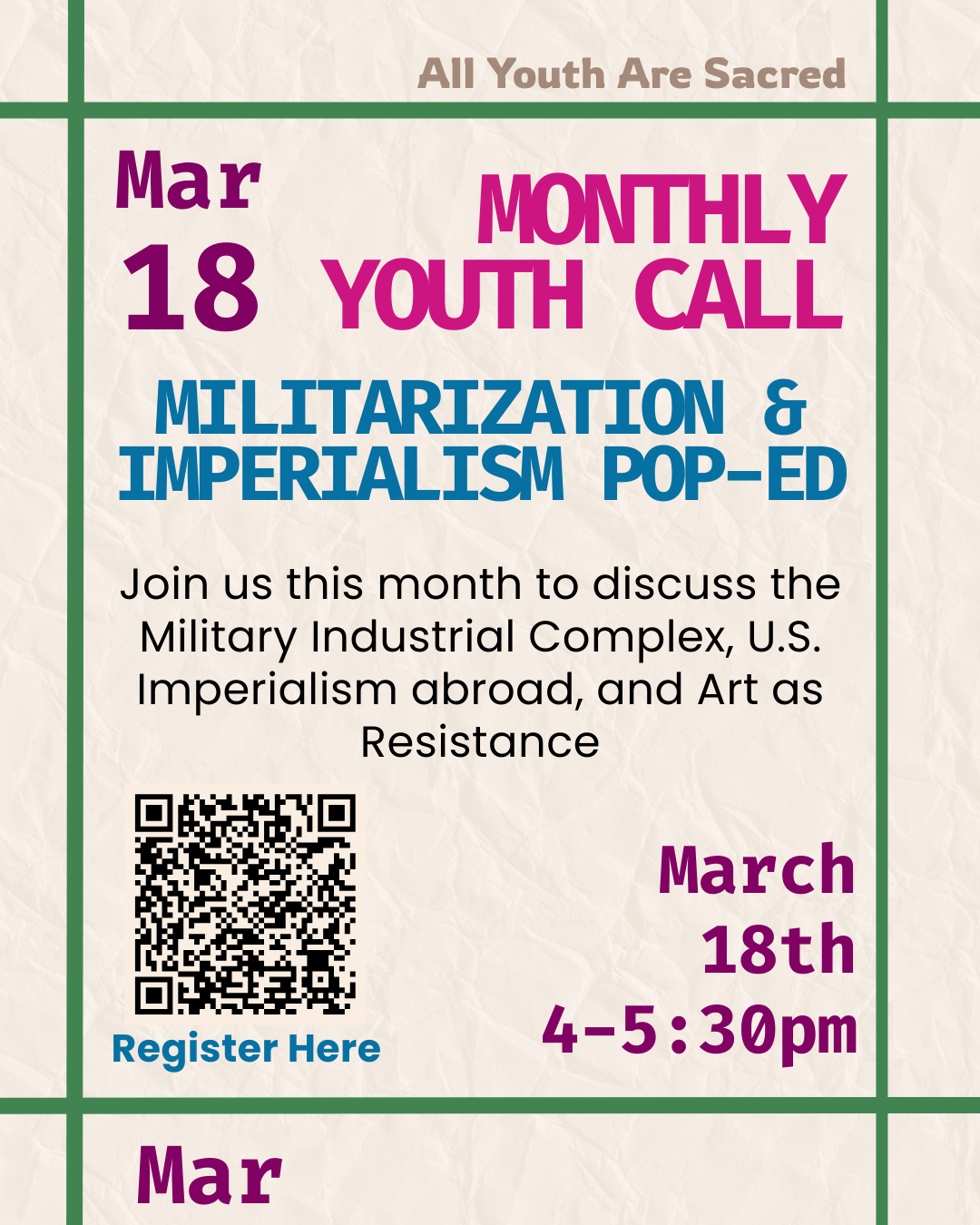 The purpose of this youth call is to provide context of today's war climate & allow for young people to express their thoughts, opinions, & feelings about the world.