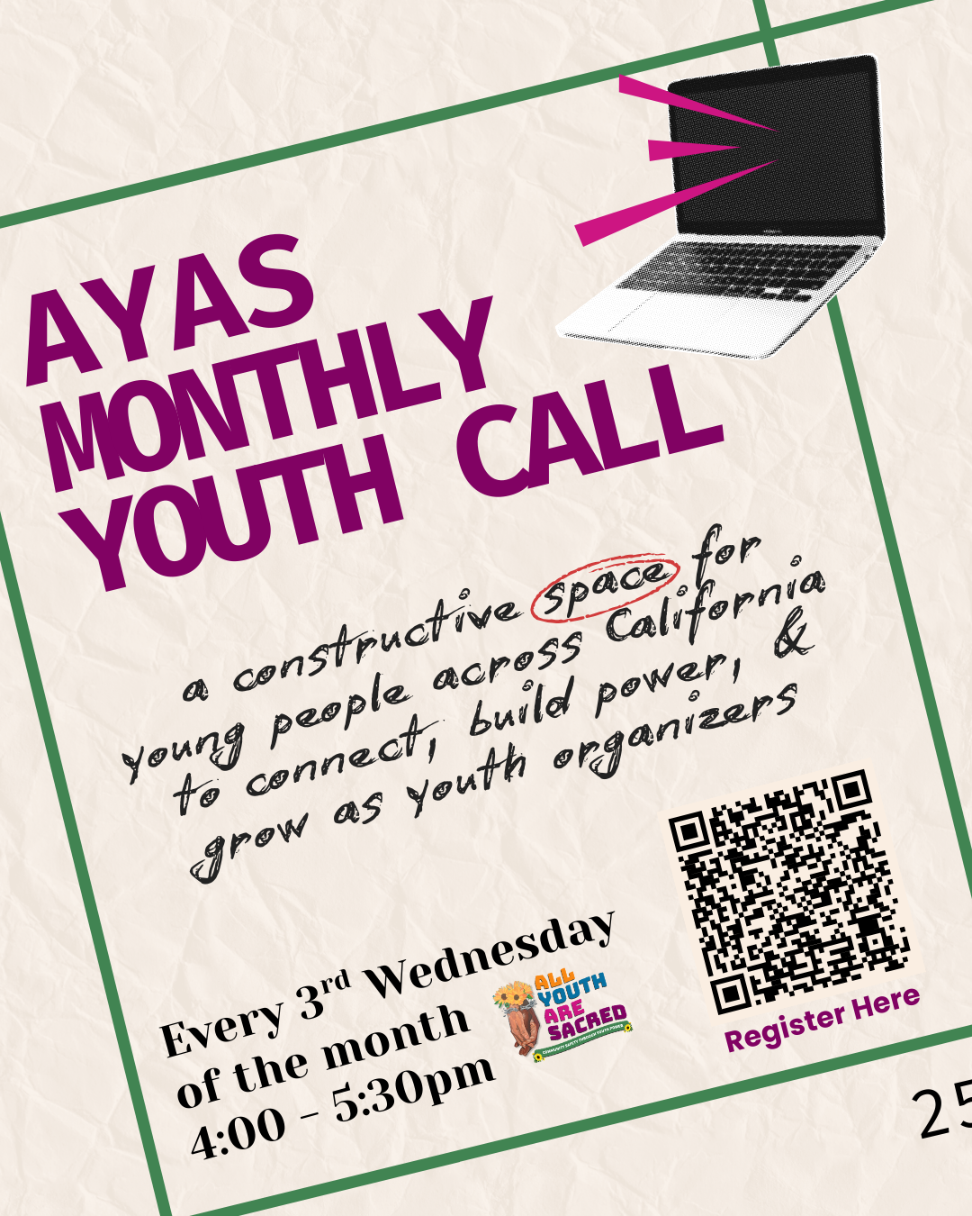 The All Youth Are Sacred Monthly Youth Call is a constructive space for young people across California to connect, build skills, & grow as youth organizers. This space is inspired by the California Alliance for Youth & Community Justice RESPECT Call space.
